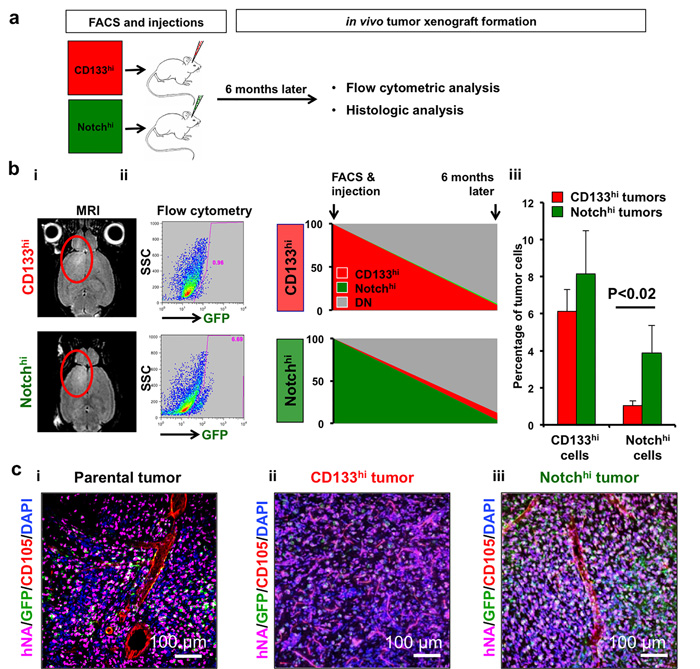 Figure 3: Notchhi cells reside higher in the cellular hierarchy in vivo. a. Cells were isolated with FACS and xenograft tumors generated were analyzed by flow cytometry and histology 6 months after injection. b., i Tumor cells were isolated from intracranial xenografts generated either by CD133hi or Notchhi cells (GBML8) after confirmation of tumors with MRI. b., ii-iii Flow cytometric analysis revealed that tumors initiated by CD133hi GSCs contained significantly lower numbers of Notchhi cells, whereas CD133 percentages did not significantly change between the two different types of tumors (n = 3 animals/condition, ANOVA F(1,8) = 9.7, P < 0.01). c. Confocal immunofluorescence analysis of tumor xenografts generated by parental (i), CD133hi (ii) and Notchhi (iii) GBML8 cells shows that tumors generated by Notchhi GSCs more closely resemble parental tumors than CD133hi tumors (n = 3 animals/condition).