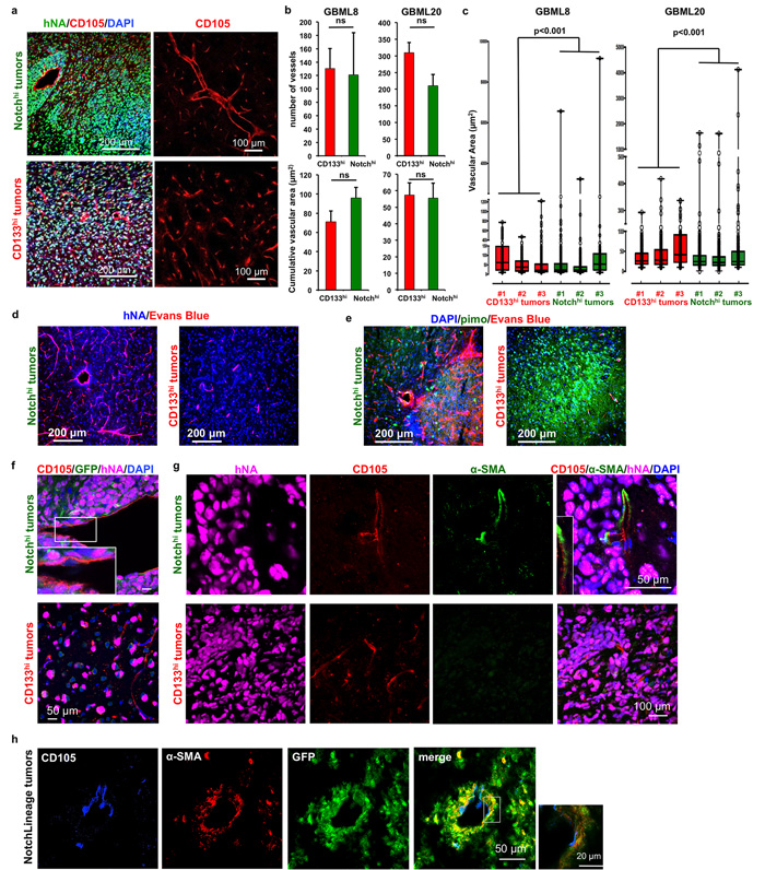 Figure 4: CD133hi and Notchhi GSCs have distinct angiogenic properties. a. Representative images of GBML8 xenografts show the contrast in vascular morphology of tumors derived from Notchhi (top panel) and CD133hi (bottom panel) cells (n = 3 animals/cell type). b. No significant change was observed in the number of vessels and average vascular area in xenografts generated by Notchhi or CD133hi cells from cultures GBML8 and GBML20 (4 20x fields/condition, n = 3 animals/cell type, t-tests, P > 0.05). c. Notchhi-initiated tumors contain large-caliber vessels, which are absent in CD133hi tumors (GBML8 and GBML20, n = 3 animals/cell type; Wilcoxon test, P < 0.001). d.,e. CD133hi tumors showed reduced perfusion (Evans Blue staining) and increased hypoxia (pimonidazole staining), compared to tumors generated by Notchhi cells (representative images from GBML8 xenografts, n = 3 animals/condition). f. Tumors initiated by Notchhi and CD133hi cells do not contain hNA+ endothelium (CD105+ cells) (representative images from GBML8 xenografts, n = 3 animals/cell type). g. α-SMA+ pericytes envelope larger vessels in Notchhi tumors (top panel). CD133hi tumors are devoid of pericytes (representative images from GBML8 xenografts, n = 3 animals/cell type). h. Lineage tracing in GBML8 xenografts shows GFP+ pericytes, indicating that they are derived from Notchhi cells. The inset shows that CD105+ endothelium is GFP- (n = 3 animals). ns: not significant.
