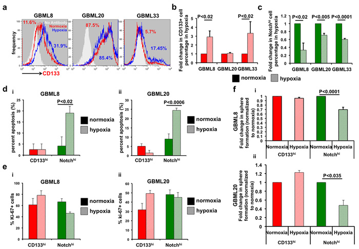 Figure 6: CD133hi GSCs expand in hypoxic conditions at the expense of Notchhi GSCs. a., b. Flow cytometry shows increased abundance of CD133hi cells after 24 hours of hypoxia in 2 of 3 cultures (GBML8 and GBML33: t-test, P < 0.02). c. The abundance of Notchhi GSCs significantly decreases in the same conditions (t-test, P < 0.02, n = 3 primary cultures). d. Percent of cells in apoptosis analyzed by TUNEL assay: (i) GBML8: ANOVA, F(1,8) = 5.57, P < 0.05; (ii) GBML20: ANOVA, F(1,8) = 10.79, P < 0.01. e. Percent Ki67+ cells in CD133hi and Notchhi GSCs from two different GBM cultures after 24 hours of hypoxia: (i) GBML8: ANOVA, F(1,8) = 0.047, P > 0.05; (ii) GBML20: ANOVA, F(1,8) = 1.9, P > 0.05). f. FACS-isolated CD133hi and Notchhi cells were allowed to form tumorspheres after 24 hours of hypoxia. Tumorsphere formation was analyzed 7 days later. Notchhi GSCs showed a significant reduction in their tumorsphere formation ability after hypoxia, whereas no significant change was observed in CD133hi GSCs: (i) GBML8: ANOVA, F(1,8) = 20.27, P < 0.002; (ii) GBML20: ANOVA, F(1,8) = 56.10, P < 0.018.