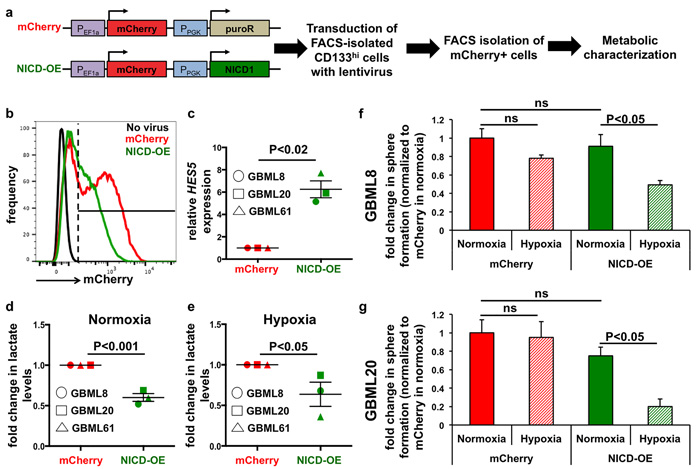 Figure 7: Ectopic Notch activation reprograms metabolism. a. Schematic representation of the lentiviral constructs used for ectopic activation of the Notch pathway (NICD-OE) or the control vector (mCherry) and the experimental plan. b. Representative FACS plot from GBML8 cells that were infected with either NICD-OE or mCherry virus, showing transduction efficiency. c. FACS-isolated mCherry+ cells from GBML8, GBML20 and GBML61 cultures showed increased HES5 transcript in the NICD-OE condition (n = 3 primary cultures, t-test, P < 0.02). d., e. Lactate level measurements in FACS-isolated mCherry+ cells after 24 hours of (d). normoxia or (e) hypoxia. NICD-OE led to significant downregulation in lactate levels in 3 primary cultures: (d) t-test, P < 0.001; (e) t-test, P < 0.05). (f-g) mCherry+ cells from GBML8 and GBML20 cells transduced with NICD-OE or mCherry virus were subjected to tumorsphere formation assay under normoxia or hypoxia. Ectopic Notch activation led to reduced tumorsphere formation under hypoxic conditions, whereas mCherry control did not show any change (n = 3/condition): f. GBML8: ANOVA, F(3,8) = 6.543, P < 0.05; (g) GBML20: ANOVA, F(3,12) = 8.256, P < 0.01. ns: not significant.