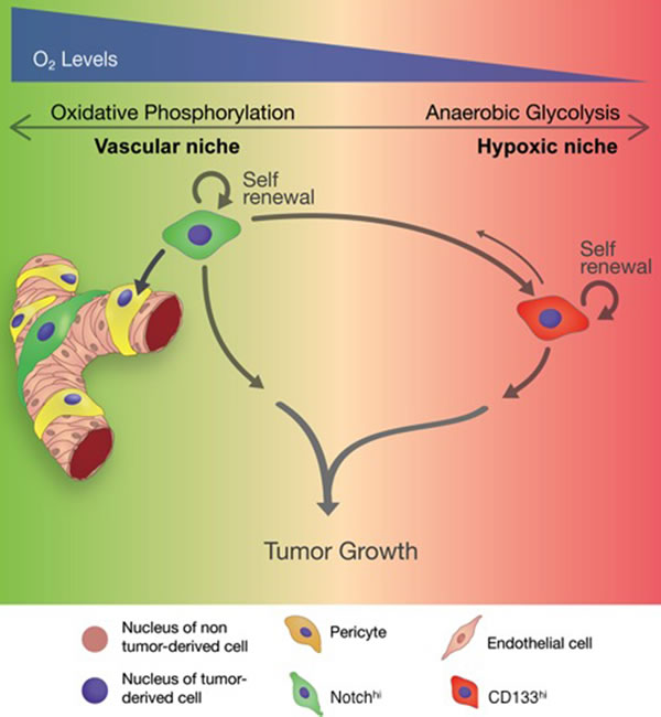 Our model also shows that CD133hi GSCs populate the tumor more diffusely, with reduced requirement for perivascular localization. This observation is consistent with previous demonstrations of CD133 immunoreactivity in both perivascular and hypoxic niches in GBM [19, 20]. The DP population in our study may indeed reflect this perivascular cell population that expresses CD133 and still relies on Notch signaling. However, our findings strongly suggest a hierarchical relationship between Notchhi and CD133hi cells. We postulate that, as the tumor expands and tumor cells move away from vessels, Notchhi GSCs generate DP and, subsequently, CD133hi lineages. We found that CD133hi GSCs have limited differentiation capacity and do not generate Notchhi cells or pericytes. Tumors initiated by CD133hi cells are hypoxic due to underdeveloped vasculature and reduced blood perfusion. To adapt to this hypoxic microenvironment, CD133hi GSCs specifically entrain a defined transcriptional network that allows them to bias glucose metabolism to anaerobic glycolysis rather than oxidative phosphorylation. While CD133hi cells thrive in hypoxic conditions, Notchhi GSCs undergo apoptosis, suggesting that their preference for aerobic glucose metabolism mandates a perivascular niche. Therefore, we propose that Notchhi and CD133hi GSCs support tumor growth via two parallel mechanisms.