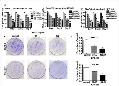 Figure 2: Effects of KPT-185 on PC cell growth. A. BxPC-3, Colo-357 and MIAPaCa cells were seeded in 96-well plates at a density of 5,000 cells per well and treated with the indicated concentrations of KPT-185 for 0-72 hrs. After treatment, cell viability was determined using the MTT assay as described in Materials and Methods. Vertical bars indicate the means + SD of three independent experiments. *p<0.05, **p<0.01 versus control. B. Cells treated with different concentrations of KPT-185 for 72 h were evaluated by the clonogenic assay. Photographic difference in colony formation in BxPC-3 and Colo-357 untreated and treated with KPT-185 are shown. C. Quantification of colony numbers in control vs treated BxPC-3 and Colo-357 cells shown in B. * p values represent comparisons between cells treated by KPT-185 and control using the paired t test.