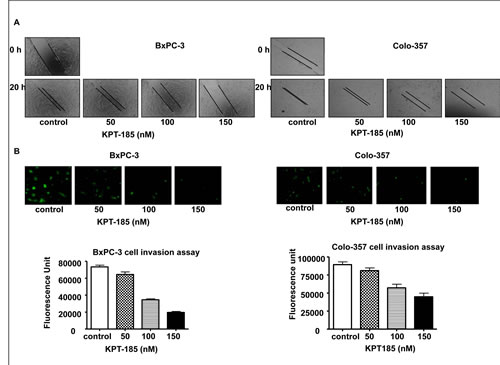 Wound healing assay was conducted to examine the capacity of cell migration. BxPC-3 and Colo-357 were seeded in a six well plate at the concentration of 3×105 cells per well. The wound was generated in the cells with 90-95 % confluent by scratching the surface of the plates with a sterile pipette tip. The cells were then incubated in the absence and presence of KPT-185 for 20 hrs, and then photographed with a Nikon microscope.