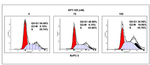 In order to verify whether KTP-185 works by abrogating cell cycle progression, propidium iodide flow cytometry assays were performed. BxPC-3 cells were exposed to 75 and 100 nM of KPT-185 for 72 hrs and analyzed for cell cycle distribution. As expected, increasing concentrations of KPT-185 resulted in G2-M arrest patterns (Fig 4). Similar results were obtained for Colo-357 cells (data not shown). These findings further solidify the case for KPT-SINEs as effect agents against PDAC. We further investigated the apoptotic potential and also evaluated the mechanism supporting KPT-185 activity and the results are presented below.
