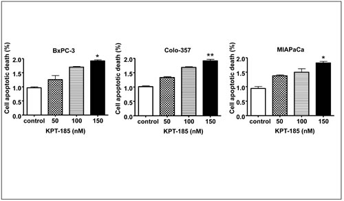 Figure 5: KPT-185 induces apoptosis in PC cells. BxPC-3, Colo-357 and MIAPaCa cells were exposed to different concentrations of KPT-185 for 72 h. Apoptosis were determined by histone/DNA ELISA. Columns, mean; bars, SD. *p<0.05, **p<0.01, compared with control.