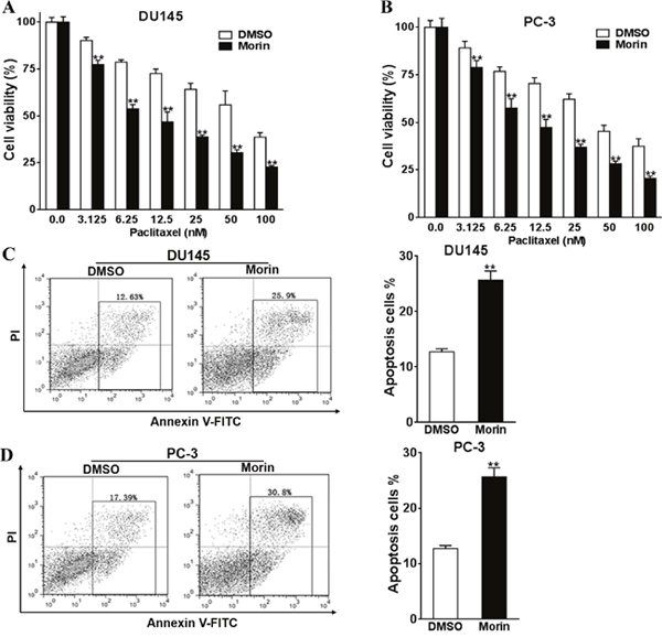Figure 1: Morin promotes prostate cancer cells chemosensitivity to paclitaxel. (A, B) The cell viabilities of DU145 and PC-3 cells to morin (50 μM) and paclitaxel (0-100 nM) were evaluated using CCK-8 assay after 48 h of incubation. (C, D) The apoptosis levels of DU145 and PC-3 cells to the treatment of morin (50 μM) and paclitaxel (50 nM) were determined by flow cytometry. All of the experiments were triplicated and data were shown in mean±SD, and the data were shown as the percentage compared to the DMSO control. Student T tests were used to verify the significance of differences between two groups. ** p<0.01, indicate significant difference compared to DMSO control.