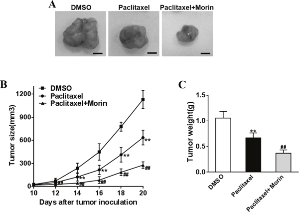 Figure 2: Morin enhances the sensibility of prostate cancer cells to paclitaxel in vivo. The DU145 cells (5 × 106) were suspended in serum-free 1640 medium (100 μL) and were subcutaneously injected into each side of posterior flank of the nude mice (n=4 for each group at indicated time point), then paclitaxel (50 mg/kg) and morin (50 mg/kg) was added or not by tail vein injection. (A-C) Tumors were measured every two days since they were apparently seen and the volumes were calculated using the following formula: volume = 0.5 × Length × Width2. Tumors were excised and weighed after 20 days with representative pictures of tumors shown (Bar=10mm). All of the experiments were triplicated and data were shown in mean±SD. Student T tests were used to verify the significance of differences between two groups. One or two-way ANOVA analyses was employed for analyzing statistical differences between multiple groups. ** p<0.01, indicate significant difference compared to DMSO group. ## p<0.01, indicate significant difference compared to Paclitaxel group.