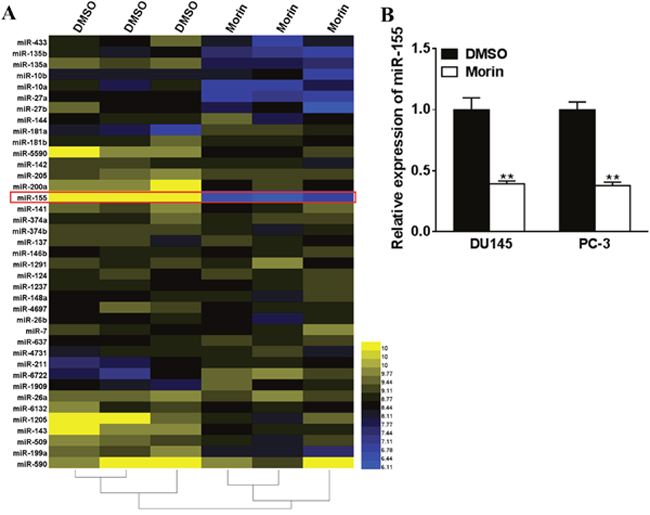 Figure 3: Morin inhibites miR-155 expression in prostate cancer cells. (A) Morin (50 μM) or DMSO were added into the medium of DU145 cells, and after 24 h of incubation, the levels of miRNAs were checked by microarray. (B) DU145 cells were incubated with 50 μM morin or DMSO, and after 24 h, the intracellular concentrations of miRNAs were checked by qRT-PCR. All of the experiments were triplicated and data were shown in mean±SD. Student T tests were used to verify the significance of differences between two groups. ** p<0.01, indicate significant difference compared to DMSO group.