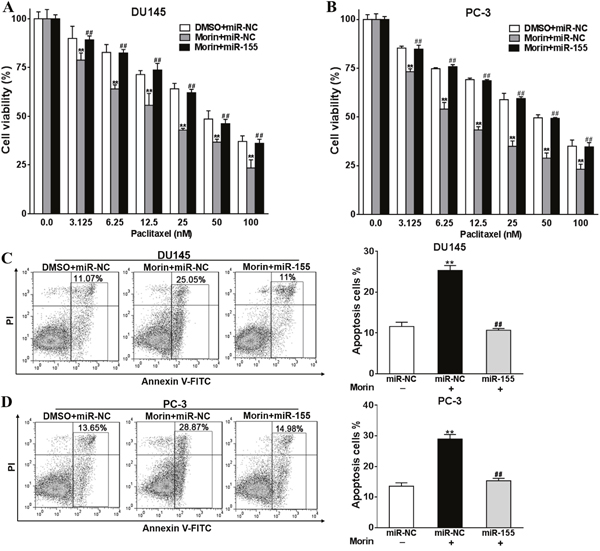 Figure 5: Overexpression of miR-155 reverses the roles of morin in promoting prostate cancer cells sensitivity to paclitaxel. (A, B) DU145 or PC-3 cells were transfected with miR-155 mimics, or control miR-NC, and were treated with 50 μM morin or DMSO and 0, 3.125, 6.25, 12.5, 25, 50, 100 nM paclitaxel. After 48h, CCK-8 assay was used to detected cell viability. (C, D) DU145 or PC-3 cells were transfected with miR-155 mimics, or control miR-NC, and were treated with 50 μM morin or DMSO and 50 nM paclitaxel. After 48h, cell apoptosis was analyzed by flow cytometry as described. All of the experiments were triplicated and data were shown in mean±SD, and the data were shown as the percentage compared to the DMSO+miR-NC control. Student T tests were used to verify the significance of differences between two groups. One or two-way ANOVA analyses was employed for analyzing statistical differences between multiple groups. ** p<0.01, indicate significant difference compared to DMSO+miR-NC control. ## p<0.01, indicate significant difference compared to Morin +miR-NC group.
