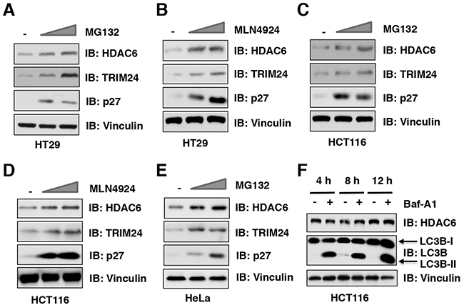 Figure 1: The ubiquitin proteasome system, but not autophagosome-lysosome, controls the protein stability of HDAC6 in cells. (A-B) Immunoblot (IB) analysis of whole cell lysates (WCLs) derived from HT29 cells treatment with 10 μM, 20 μM MG132 (A) or 1 μM, 2 μM MLN4924 (B) for 12 hours before harvesting. (C-D) IB analysis of WCLs derived from HCT116 cells treatment with 10 μM, 20 μM MG132 (C) or 1 μM, 2 μM MLN4924 (D) for 12 hours before harvesting. (E) IB analysis of WCLs derived from HeLa cells treatment with 10 μM or 20 μM MG132 before harvesting. (F) IB analysis of WCLs derived from HCT116 cells treatment with/without 100 nM Bafilomycin A1 (Baf-A1) at indicated time course before harvesting.