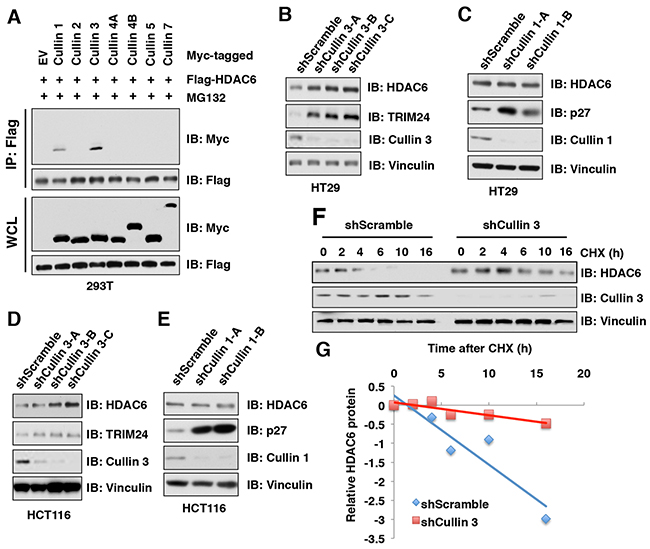 Figure 2: HDAC6 protein stability is negatively regulated by the Cullin 3 family E3 ligase. (A) IB analysis of WCLs and immunoprecipitates (IP) derived from 293T cells transfected with Flag-HDAC6 and Myc-Cullins constructs as indicated and treated with 10 μM MG 132 before harvesting. (B-C) IB analysis of WCLs derived from HT29 cells infected with the indicated lentiviral shCullin 3 (B) or shCullin 1 (C), respectively. (D-E) IB analysis of WCLs derived from HCT116 cells infected with the indicated lentiviral shRNAs against Cullin 3 (D) or Cullin 1 (E), respectively. (F-G) IB analysis of WCLs derived from HT29 cells stably infected with the indicated lentiviral shRNAs and treated with 100 μg/ml cycloheximide (CHX) for indicated times (F). Quantification of the band intensities of (F) using the ImageJ software (G). HDAC6 immunoblot bands were normalized to Vinculin, then normalized to the t = 0 time point.