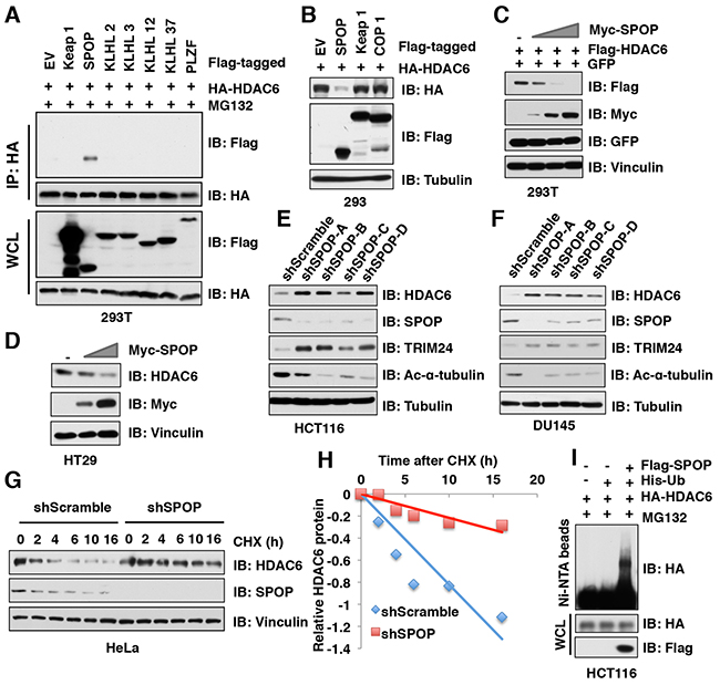 Figure 3: SPOP, but not other Cullin 3 family adaptor proteins, specifically interacts with and promotes HDAC6 poly-ubiquitination and degradation. (A) IB analysis of WCLs and IP derived from 293T cells transfected with HA-HDAC6 and Flag-tagged Cullin 3 family adaptor constructs as indicated and treated with 10 μM MG132 for 12 hours before harvesting. (B-C) IB analysis of WCL derived from 293 (B) or 293T (C) cells transfected with indicated constructs. (D) IB analysis of WCL derived from HT29 cells transfected with indicated constructs. (E-F) IB analysis of WCL derived from HCT116 (E) or DU145 (F) infected with the indicated lentiviral shRNAs against SPOP and subjected to puromycin selection for 72 hours before harvesting. (G-H) IB analysis of WCL derived from HeLa cells stably infected with the indicated lentiviral shRNAs against SPOP and treated with 100 μg/ml CHX for indicated times (G). Quantification of the band intensities of (G) using the ImageJ software (H). HDAC6 immunoblot bands were normalized to Vinculin, then normalized to the t = 0 time point. (I) IB of WCL and His pull-down from HCT116 cells transfected with the indicated constructs. Cells were treated with 30 μM MG132 for 6 hours and lysed with denature buffer.