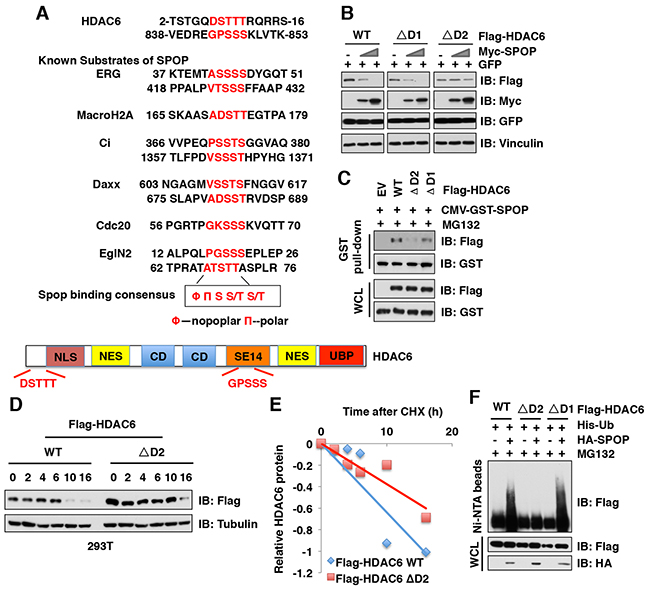 Previous studies from us and other groups have identified that SPOP substrates including Ci/Gli [24], Daxx [25], MacroH2A [26], ERG [27, 28], AR [29, 30], PTEN [31] SRC-3 [32], DEK [33], TRIM24 [33], Cdc20 [34] and EglN2 [35] share a SPOP-binding motif Φ-Π-S-S/T-S/T (Φ-nonpolar; Π, polar amino acid) (Figure 4A) [18]. Through examining the protein sequence of HDAC6, we found two putative SPOP motifs, or “degrons” in HDAC6: 7DSTTT11 (termed degron 1) and 843GPSSS847 (termed degron 2) (Figure 4A). To identify which degron is required for SPOP-mediated degradation of HDAC6, we generated HDAC6 mutants with deletion of each individual degron and found that HDAC6 harboring deletion of degron 2 (ΔD2), but not degron 1 (ΔD1), became largely resistant to SPOP-mediated HDAC6 degradation (Figure 4B). Consistently, compared to WT or ΔD1 mutant, the HDAC6-ΔD2 mutant lost its ability to bind with SPOP and exhibited an extended half-life in cells (Figure 4C-4E). Furthermore, HDAC6 with ΔD2 mutant, but not the ΔD1 mutant, became resistant to SPOP-mediated poly-ubiquitination in cells (Figure 4F). These results together demonstrate that the degron 2 motif 843GPSSS847 is required for SPOP to recognize and promote the poly-ubiquitination and subsequent degradation of HDAC6 in cells.