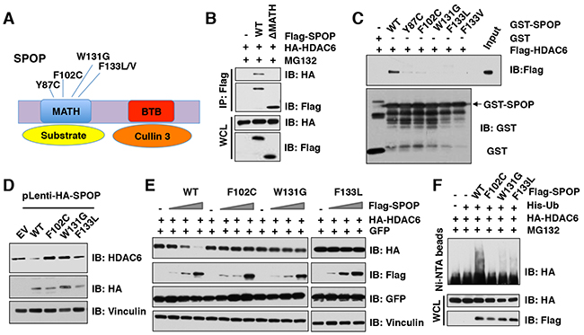 Figure 5: Cancer-associated SPOP mutants fail to interact with and promote the degradation of HDAC6 in cells. (A) A schematic illustration of SPOP with MATH and BTB domain and cancer-associated mutations. (B) Immunoblot (IB) analysis of whole cell lysates (WCL) and immunoprecipitates (IP) derived from HeLa cells transfected with indicated plasmids and treated with 10 μM MG132 before harvesting. (C) IB analysis of WCLs and GST pull-down products derived from 293T cells transfected with indicated constructs. (D) IB analysis of WCL derived from melanoma WM2664 cells stably expressed with SPOP WT and SPOP mutants. (E) IB analysis of WCL derived from 293T cells transfected with indicated constructs. (F) IB of WCL and His pull-down from HCT116 cells transfected with the indicated constructs. Cells were treated with 30 μM MG132 for 6 hours and lysed with denature buffer.