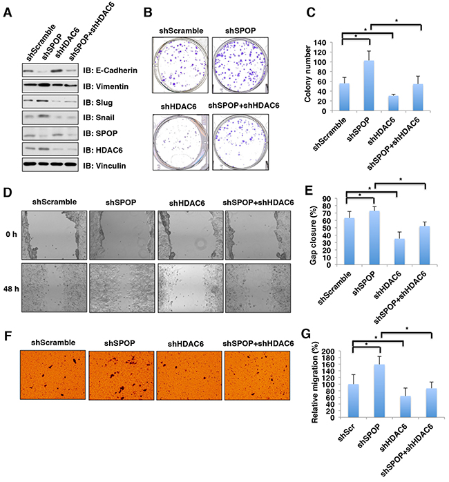Figure 6: Depletion of SPOP enhances the cellular proliferation and migration, which can be reversed partly by additional depletion of HDAC6 in colon cancer cells. (A) Immunoblot (IB) analysis of whole cell lysates (WCL) derived from HCT116 infected with the indicated lentiviral shRNAs against SPOP and HDAC6, and subjected to puromycin selection for 72 hours before harvesting. (B) Colony formation assay using HCT116 cells described in Figure 6A. (C) Quantification of colony number of colony formation assays described in Figure 6B. Data were shown as mean ± SD from three independent experiments. *p < 0.05. (D) In vitro scratch assay at 0 and 48 hours using HCT116 cells described in Figure 6A. (E) Quantification of gap closure of in vitro scratch assay described in Figure 6D. Data were shown as mean ± SD from three independent experiments. *p < 0.05. (F) Representative images of migrated HCT116 cells described in Figure 6A in migration assays. (G) Quantification of migrated cells described in Figure 6F. Data were shown as mean ± SD of three independent experiments. *p < 0.05.