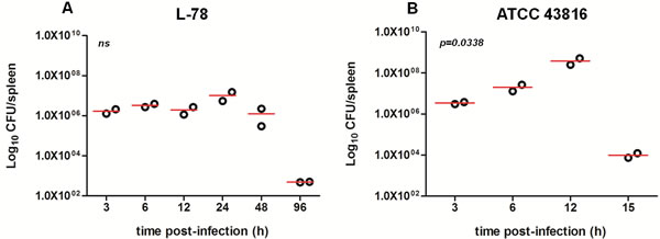 Figure 2: Bacterial load in the spleen of CD-1 mice infected with 108 CFU L-78 A. and 106 CFU ATCC 43816 B. Two mice from each group were sacrificed at the same time points as in Figures 1A and 1B and for an additional time point (96 h) for L-78 infected animals to confirm bacterial clearance. Spleen homogenates were plated on agar and CFU counts were determined. Data are Log10CFU/spleen from two independent experiments. ns, not significant after one-way ANOVA.