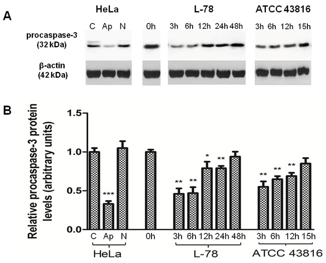 Figure 4: Procaspase-3 levels decreased early after L-78 infection in murine spleen lysates. A. Total protein extracts of pooled splenocytes from L-78- and ATCC 43816-infected mice were immunoblotted against procaspase-3. Apoptotic and necrotic HeLa cells were used as controls. β-Actin was used as a loading control. All samples were run on and cut from the same gel. B. Densitometric analysis of procaspase-3. Data are means ± SD from three independent experiments. C, HeLa cells incubated in medium; Ap, apoptotic HeLa cells; N, necrotic HeLa cells. *, p < 0.05; **, p < 0.01; ***, p < 0.001, compared with control after Student’s unpaired t-test.