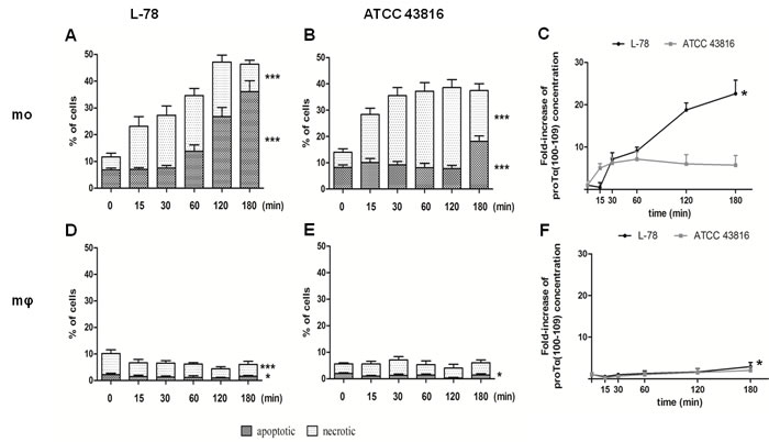 Figure 5: High levels of proTα(100-109) correlated with higher percentages of apoptotic human monocytes in vitro infected with L-78. Human monocytes A. and B. and in vitro-differentiated macrophages D. and E. infected with L-78 A. and D. or ATCC 43816 B. and E. were harvested at 0-180 min, stained with Annexin V/PI and analyzed by flow cytometry. Dark columns show percentages of apoptotic cells; white columns, necrotic cells. Mean values ± SD from 5 different healthy blood donors are shown. ***, p < 0.0001 for L-78-infected apoptotic and necrotic monocytes A., for ATCC 43816-infected apoptotic and necrotic monocytes B. and for L-78-infected necrotic macrophages D.. *, p = 0.0106 for L-78-infected apoptotic macrophages D. and p = 0.0229 for ATCC 43816-infected apoptotic macrophages E. (one-way ANOVA). Supernatants from the same cultures were analyzed by ELISA and proTα(100-109) concentration is expressed as mean fold-increase ± SD from three independent experiments C. and F. *, p = 0.0015 for L-78-infected monocytes C. and p = 0.0324 for L-78-infected macrophage F. (one-way ANOVA).