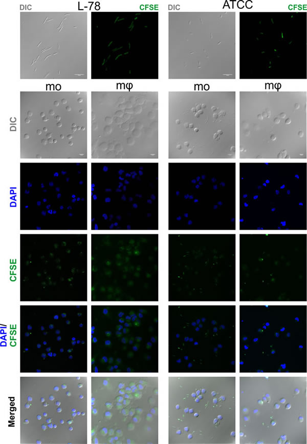 Confocal microscopy confirmed the intracellular localization of L-78 in monocytes/macrophages, excluding the possibility of bacterial adherence on the cell surface. Analysis was conducted by examining coverslips on which monocytes and macrophages were co-incubated with CFSE-labeled bacteria for 30 min, a time point where high percentages of phagocytosis were recorded by flow cytometry (Figure 6). In monocytes and especially macrophages infected with L-78, their typical ellipsoidal and round nuclei were surrounded by green fluorescence, suggesting that L-78 was internalized and digested by both cell subpopulations. On the contrary, monocytes and macrophages infected with ATCC 43816 emitted blue fluorescence accumulated in their characteristic nuclei, and less green fluorescence, whereas non-phagocytosed bacteria appeared in the extracellular space.