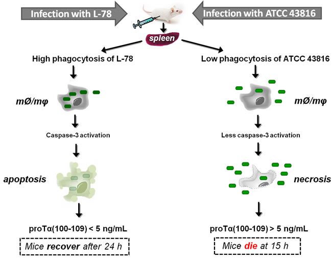 Figure 8: Proposed scenario supporting the eventual use of proTα(100-109) as an early surrogate biomarker of sepsis. Klebsiella pneumoniae strains L-78 (left) and ATCC 43816 (right) intraperitoneally injected in mice enter the bloodstream through the microcirculation of the peritoneum, infect internal organs, e.g. spleen, and multiply. In spleen, monocytes/macrophages (mØ/mφ) phagocytose L-78 (green rectangles) early post-infection (3 h) and caspase-3 levels are increased, driving cells to apoptosis. In apoptotic cells, proTα is cleaved by activated caspase-3 and the decapeptide proTα(100-109) is gradually exocytosed. Finally, L-78 is cleared; mice control the infection (at ~24 h) and recover. On the contrary, ATCC 43816 is minimally phagocytosed by spleen monocytes/macrophages (mØ/mφ), thereby remaining in the extracellular space where they rapidly multiply. In this case, monocytes/macrophages are led to necrosis (12 h) and caspase-3 is less activated. High levels of DAMPs are extracellularly released, the bacteria are not cleared, sepsis and multiple organ failure occur, and by 15 h all mice die.
