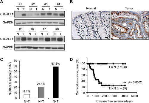 Figure 1: C1GALT1 is frequently overexpressed in colorectal tumors and its overexpression predicts poor survival of colorectal cancer patients. (A) Western blots of C1GALT1 expression in paired normal (N) and tumor (T) tissue from colorectal cancer patients (n = 8). (B) Immunohistochemistry (IHC) of C1GALT1 expression in paired normal and tumor tissue of colorectal cancer. Representative images are shown. Negative controls did not show any specific signals (data not shown). Scale bar indicates 25 μm. (C) C1GALT1 is frequently overexpressed in colorectal tumors (T) compared with their adjacent normal tissues (N). (D) C1GALT1 overexpression predicts poorer survival of patients with colorectal cancer. Cumulative survival rate was analyzed by Kaplan-Meier survival analysis for colorectal cancer patients (n = 87). **p < 0.01.