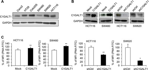 Figure 2: C1GALT1 expression in colon cancer cells. (A) Expression of C1GALT1 in six colon cell lines was analyzed by Western blotting. GAPDH is an internal control. (B) Western blots showing overexpression and knockdown of C1GALT1 in colon cancer cells. C1GALT1 was stably overexpressed by transfection with empty vector (Mock) or C1GALT1/pcDNA3.1 plasmid (C1GALT1) in HCT116 and SW480 cells. C1GALT1 was stably knocked down with control shRNA (shCtrl) or C1GALT1-specific shRNA (shC1GALT1) in HCT116 and SW620 cells. (C) Effects of C1GALT1 on T antigen expression of colon cancer cell surfaces. Surface T antigens were detected by flow cytometry with FITC-PNA and results are presented as percent mean fluorescence intensity (% of MFI) compared with mock, normalized to cell number and background fluorescence, from three independent experiments. *p < 0.05; **p < 0.01.