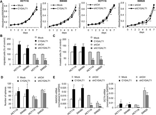 Figure 3: C1GALT1 regulates malignant phenotypes of colon cancer cells. (A) Effects of C1GALT1 on viability of colon cancer cells. Cell viability was analyzed in C1GALT1 overexpressing HCT116 and SW480 cells and in C1GALT1 knockdown HCT116 and SW620 cells by MTT assays. **p < 0.01. (B) Effects of C1GALT1 on cell migration. Cell migration was analyzed by transwell migration assays. DMEM containing 10% FBS were used as chemoattractants. After 48 h, the number of migrated cells from 6 random fields was counted. Results are presented as mean ± SD from three independent experiments. **p < 0.01. (C) Effects of C1GALT1 on cell invasion. Cell invasion was analyzed by matrigel invasion assays. **p < 0.01. Similar analyses were used as those for migration assays. (D) Effects of C1GALT1 on sphere formation. Sphere formation assays were performed in serum free medium supplemented with B27 and treated with 20 µg/ml EGF and 25 µg/ml bFGF. The number of spheres formed was counted after visualizing by MTT. Results are presented as mean ± SD from three independent experiments. *p < 0.05. (E) Effects of C1GALT1 on the expression of stem cell markers. C1GALT1 modulated the mRNA expression of NANOG and OCT4 analyzed by real-time RT-PCR. GAPDH is an internal control. *p < 0.05; **p < 0.01.