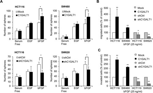 Figure 4: C1GALT1 regulates bFGF-induced malignant phenotypes in colon cancer cells. (A) Effects of C1GALT1 on sphere formation induced by EGF or bFGF in colon cancer cells. Sphere formation assays were performed in serum free medium supplemented with 1 × B27 and treated with 20 µg/ml EGF or 25 µg/ml bFGF. Numbers of spheres formed were counted. Results are presented as mean ± SD from three independent experiments. *p < 0.05. (B) Effects of C1GALT1 on bFGF-mediated cell migration. For transwell migration assays, 25 µg/ml bFGF in serum free DMEM was used as chemoattractants. Results are displayed as percentage of migrated cells relative to control and presented as mean ± SD from three independent experiments. *p < 0.05. **p < 0.01. (C) Effects of C1GALT1 on bFGF-induced cell invasion analyzed by matrigel invasion assays **p < 0.01.