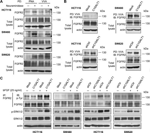 Figure 6: C1GALT1 modifies O-glycans on FGFR2 and regulates bFGF-induced FGFR2 activation in colon cancer cells. (A) FGFR2 carries O-glycans in colon cancer cells. Lysates of HCT116, SW480, and SW620 cells were treated with (+) or without (-) neuraminidase and pulled down (PD) by either PNA or VVA lectin agarose beads and blotted with anti-FGFR2 antibody. Actin is an internal control. (B) C1GALT1 modifies FGFR2 O-glycosylation in colon cancer cells. Lysates from C1GALT1 overexpressing HCT116 and SW480 cells (upper panels) and C1GALT1 knockdown HCT116 and SW620 cells (lower panels) were subjected to VVA lectin pull down (PD) and immunoblotted with anti-FGFR2 antibody. Actin is an internal control. (C) C1GALT1 expression regulated FGF-induced phosphorylation of FGFR2 and ERK1/2. Cells were serum starved and treated with (+) or without (-) bFGF 25 ng/ml for 5 min. Cell lysates were then immunoprecipitated with anti-FGFR2 antibody and blotted with anti-phosphotyrosine (4G10) or anti-FGFR2 antibodies. Levels of p-ERK1/2 and total ERK1/2 were also analyzed. Actin was used as a loading control.