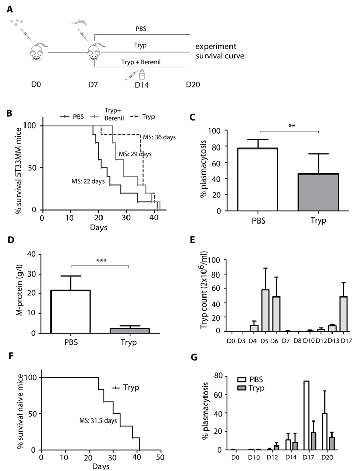 Taken the fact that trypanosomes have adopted the capacity to induce a major remodeling of the host B cell compartment, we wished to investigate whether trypanosome infections could affect the outcome of MM. We herefore used the 5T33MM model, which is an immune competent model of MM, that mimics the human disease characteristics very closely in terms of BM homing, the production of M-protein (serum M-spike) and the development of osteolytic bone lesions [11].