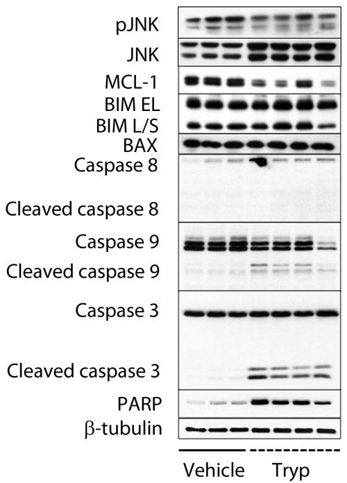 Next, the mechanisms implicated in T. brucei mediated tumor suppression were investigated. In the period between day 17 and 20 after 5T33MM inoculation, differences in bone marrow plasmacytosis between uninfected and infected 5T33MM mice were most pronounced (Figure 1G). Therefore day 20 was chosen as time point to isolate MM cells. We found that the MM cells died by apoptosis, as shown by cleavage of caspase-3 and PARP (Figure 2). Processing of caspase-9 but not of caspase-8 further demonstrated the activation of the intrinsic apoptotic pathways. Apoptosis induction was also associated with reduced MCL-1 levels, and normal expression of Bim and Bax. Although JNK levels were higher, the activated state of the kinase was unchanged (Figure 2).