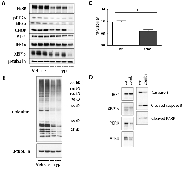 Figure 3: Effects of T. brucei on unfolded protein response pathways in 5T33MM cells. A.-B. 7 days after inoculation with 5T33MM cells, mice were divided into 2 groups. One group was infected with T. brucei (n = 12, pooled to 4 samples), the other served as control (n = 3). Mice were sacrificed at day 20. 5T33MM cells were isolated from the bone marrow and purified to > 85% by depletion of CD11b+ cells with MACS sorting. Western blot analysis for PERK, ATF4, CHOP, IRE1, GRP-78, caspase-12, pEIF2A, EIF2A, XBP-1 was performed. β-tubulin served as loading control. B. From 2 samples of each group as depicted in A, further analysis was performed for ubiquinated proteins. β-tubulin served as loading control. C. Viability assay was performed for 24h with MM cells (purity > 90%) of 3 different mice. Cells were treated with a combination of a PERK and IRE1α inhibitor. *means p < 0.05. D. One experiment representing 3 is shown of MM cells (purity > 90%) which were treated with the combination of PERK and IRE1α inhibitors for 21 hours, followed by western blot analysis.