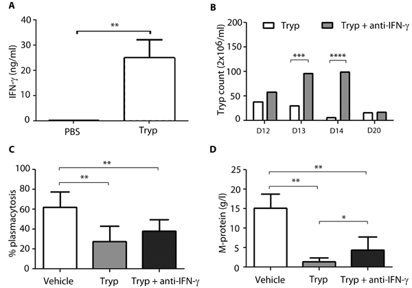 Figure 4: Effect of anti-IFNy treatment on Trypanosoma mediated apoptosis in vivo. 7 days after inoculation with 5T33MMvv, mice were divided into 3 groups (n = 10/group): 2 groups were infected with T. brucei, one group served as control. Anti-IFNy treatment (300µg) was given to one of the T. brucei infected groups, 2-times a week intraperitoneally until the end of the experiment. All mice were sacrificed when first mice showed signs of morbidity. A. IFNy levels of T. brucei treated mice, measured in serum by ELISA. B. Blood parasitemia was counted at different time points. C.+D. Tumor load was evaluated by measuring plasmacytosis and M-protein levels. The bars represent mean +/- standard deviation (SD). *means p < 0,05, ** means p < 0,01, *** means p < 0,001, **** means p < 0,0001.