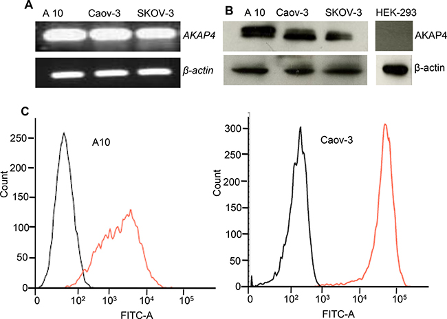 Figure 1: AKAP4 gene, protein expression and surface localization. (A) RT-PCR shows AKAP4 gene expression in ovarian cancer cell line A10, Caov-3 and SKOV3. (B) Western blot shows AKAP4 protein expression in A10, Caov-3, SKOV3 and HEK-293 (negative control). β- actin serves as loading control. (C) FACS analysis shows surface expression of AKAP4 protein in A10 and Caov-3. FITC positive cells are shown on X-axis in histogram overlay , which shows AKPA4 expression (orange line) in A10 (98%) and Caov-3 (99%) verses (6%) and (4%) in unstained population (black line) of A10 and Caov-3 respectively. The data shown as mean ± standard error of the mean (SEM) of three independent experiments. *P < 0.05; **P < 0.01.
