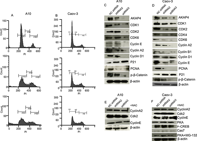 Figure 3: AKAP4 knockdown induces cell cycle arrest. (A and B) Histogram shows s-phase growth arrest after PI staining at 48 h in A10 cells and Caov-3 cells respectively. (C and D) Western blot shows various cell cycle related proteins. (E and F) Western blot shows s-phase specific proteins after 4 mm NAC pre-treatment in A10 and Caov-3 cells and PKA, p-CREB and cleaved caspage7 in Caov-3. PKA rescue in Caov-3 is shown after MG-132 (500 nm for 1 h) pre- treatment, β- actin serves as loading control. The data shown as mean ± standard error of the mean (SEM) of three independent experiments. *P < 0.05; **P < 0.01.