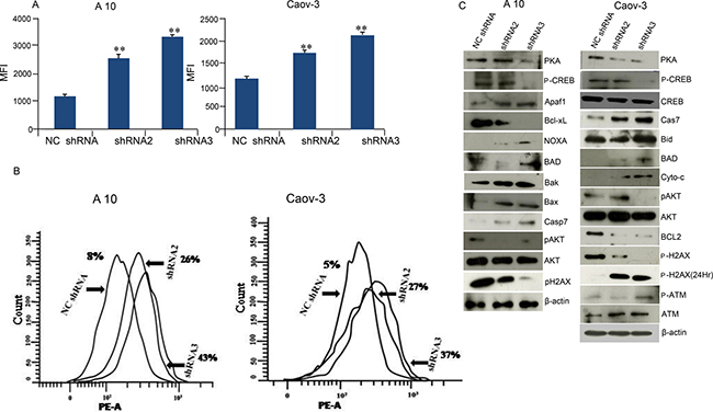 Ablation of CREB in ovarian cancer cells (A10 and Caov-3) mimicked AKAP4 ablated phenotype. PI staining after CREB ablation showed s-phase growth arrest in A10 and Caov-3 cells. In A10, shRNA1 and shRNA2 treatment showed (9%) and (13%) cells in s-phase, compared to 8% cells after NC shRNA treatment (Figure 7A). Similarly, CREB ablation in Caov-3 cells showed (13%) and (12%) accumulation in s-phase after shRNA1 and shRNA2 treatment, compared to (6%) NC shRNA treated cells (Figure 7B). An increase in sub G0/G1 population was also observed in both the cell lines after CREB ablation. S-phase specific molecules (cyclinA2, CDK2 and PCNA) were found downregulated as shown by western blotting in shRNA1 and shRNA2 treated cells (Figure 7C and 7D). After CREB knockdown, expression of apoptosis associated molecules (Apaf-1, BAD and cleaved caspase 7) were found upregulated in ovarian cancer cells as compared to NC shRNA treated cells (Figure 8A and 8B). In addition, γH2AX, a known marker of DNA damage was found upregulated in A10 and Caov-3 cells after CREB ablation. TUNEL assay was performed in A10 and Caov-3 cells 48hr post transfection to examine DNA damage which revealed increase in BrdU positive cells (43% and 55%) after shRNA2 and shRNA3 treatment in A10 and (16% and 17%) in Caov-3 cells respectively, as compared to (7%) and 8%) in A10 and Caov-3 cells treated with NC shRNA (Figure 8C and 8D).