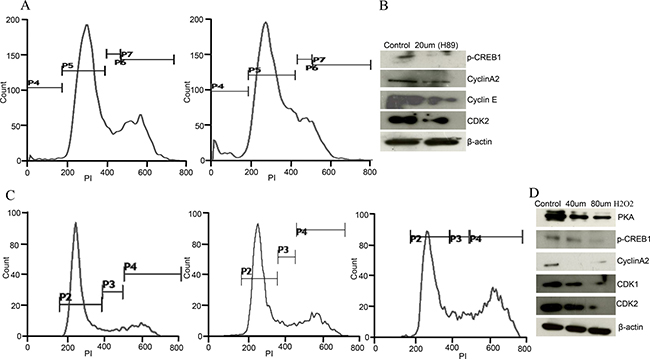 Figure 6: H89 and ROS treatment show similar phenotype in Caov-3 cells. (A) Histogram shows s-phase cell cycle arrest after PI staining treated with H89 (30 μm) in Caov-3 cells. (B) Western blot shows downregulated p-CREB, cyclinA2, cyclinE, and CDK2 after 30 μm H89 treatment in Caov-3 cells. (C) Representative histogram analysis shows S/G2M cell cycle arrest after H2O2 treatment (untreated, 40 μm and 80 μm) for 24 h in Caov-3 cells. (D) Western blot analysis shows downregulated PKA, p-CREB, cyclinA2, CDK1 and CDK2 after 40 μm and 80 μm H2O2 treatment in Caov-3 cells, β- actin serves as loading control. The data shown as mean ± standard error of the mean (SEM) of three independent experiments. *P < 0.05; **P < 0.01.