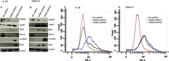 Figure 8: CREB knockdown induces DNA damage and cell death in A10 and Caov-3 cells. (A and B) Western blot shows upregulation of pro-apoptotic proteins and downregulation of anti-apoptotic protein after CREB ablation in A10 and Caov-3 cells. β- actin serves as loading control. (C and D) TUNEL assay shows increased DNA damage after CREB ablation. The data shown as mean ± standard error of the mean (SEM) of three independent experiments. *P < 0.05; * * P < 0.01.