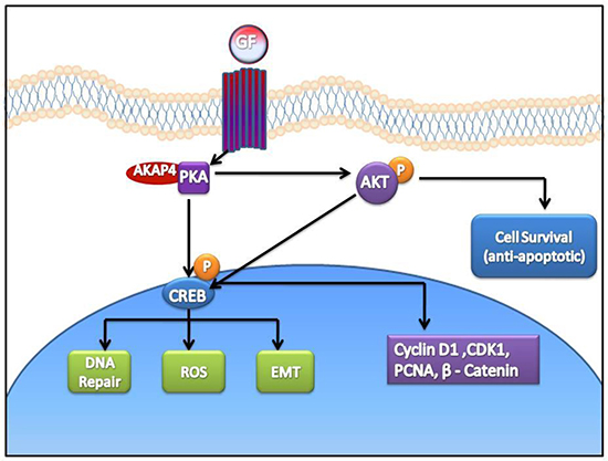 Earlier, we reported a novel CT antigen namely A kinase anchor protein (AKAP4) expression in various types of malignancies [6–9]. It has been proposed that AKAP4 functions as a scaffolding protein and tethers protein kinase A (PKA) in various signaling complexes and subcellular organelles [10]. PKA regulates various aspects of physiology including cell growth, motility and apoptosis [11]. PKA phosphorylates and mediates its effects through various substrate including cyclic AMP response element binding protein (CREB), a known regulator of various oncogenic processes in the cell [11, 12]. In this context, pro-survival nature of PKA-CREB signaling has been reported in NIH3T3 k-ras transformed cells under glucose starvation [13] and maintenance of ROS homeostasis in melanocytes [14]. In addition, PKA anchoring and its role in metastasis has been proposed in ovarian cancer cells [15].