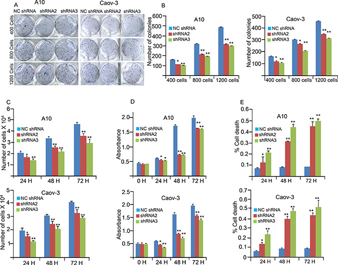 Figure 2: AKAP4 knockdown inhibits colony forming ability, cellular proliferation and cell viability. (A and B) Image and Bar diagram shows colony formation ability of A10 and Caov-3 after NC shRNA, shRNA2 and shRNA3 treatment. Significant inhibition in colony forming ability was observed in shRNA2 and shRNA3 treated cells compare to NC shRNA treated cells (C) Bar diagram depicts reduced cellular proliferation at 24 h, 48 h and 72 h in A10 and Caov-3 after AKAP4 knockdown. (D) Bar diagram depicts MTT assay at 0 h, 24 h, 48 h and 72 h after NC shRNA, shRNA2 and shRNA3 treatment. (E) Trypan blue cell exclusion assay shown in the bar diagram with significant increase in cell death after AKAP4 ablation. The data shown as mean ± standard error of the mean (SEM) of three independent experiments. *P < 0.05; **P < 0.01.