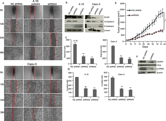 Figure 5: AKAP4 knockdown inhibits wound healing ability and cellular motility marker in A10 and Caov-3 cells and reduces tumor growth in SCID mice model. (A) Phase contrast microscopy shows decreased wound healing ability in A10 and Caov-3 cells after NC shRNA, shRNA2 and shRNA3 treatment. (B) Western blot shows decreased expression of mesenchymal marker and increased expression of epithelial marker in A10 and Caov-3, β- actin serves as loading control. (C and D) Bar diagram shows significant reduction in migrated and invaded cells after AKAP4 ablation in A10 and Caov-3 cells compared to NC shRNA treated cells. (E) Tumor volume was reduced after shRNA3 treatment significantly (P = 0.001) in SCID mice model compared to NC shRNA treated mice. (F) Western blot shows decreased expression of AKAP4, PKA and p-CREB in shRNA3 treated tumor lyaste. β- actin serves as loading control. The data shown as mean ± standard error of the mean (SEM) of two independent experiments. *P < 0.05; * * P < 0.01, * * * P < 0.001.