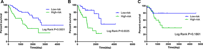 Figure 6: Kaplan–Meier curves for prognostic value of risk-score signature according to histologic subtypes. (A) Dedifferentiated liposarcoma (B) Leiomyosarcoma (LMS); (C) Undifferentiated sarcoma.
