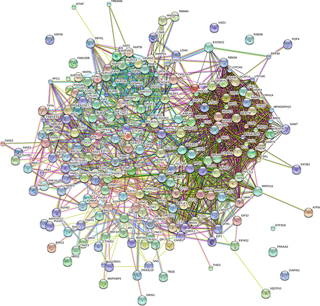 Figure 9: The protein protein interaction of correlative genes for the lncRNAs. The protein-to-protein network analysis was performed using STRING (version: STRING 10.0).