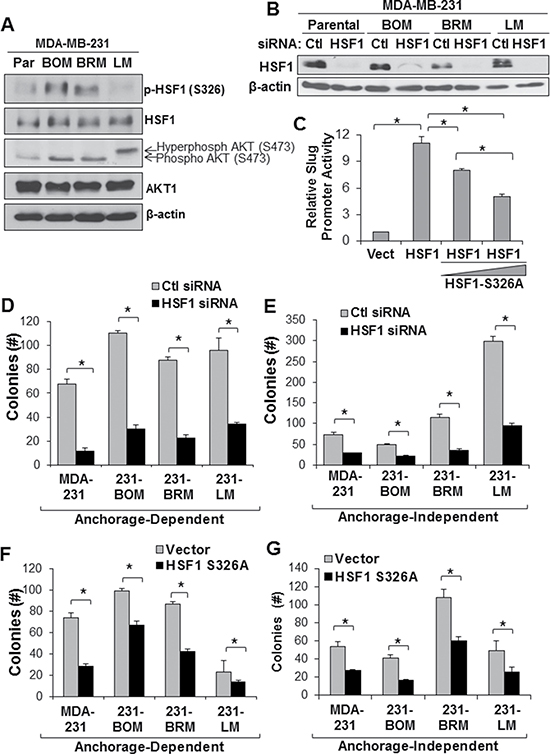 Figure 3: Loss of HSF1 activity reduces growth of metastatic breast cancer cells. (A) Lysates from MDA-MB-231 parental and metastatic cell lines were subjected to immunoblotting with indicated antibodies. (B) Cells were transfected with control or HSF1 siRNA followed by immunoblotting. (C) MCF7 cells were transfected with empty vector, HSF1, or HSF1 + HSF1-S326A followed by luciferase assay using a Slug promoter reporter. (D–E) Cells with and without HSF1 knockdown from (B) were subjected to anchorage-dependent (D) or anchorage-independent (E) colony assays. (F–G) Cells were transfected with empty vector or HSF1-S326A followed by anchorage-dependent (F) or anchorage-independent (G) colony assays. *Indicates significant difference (p < 0.05).