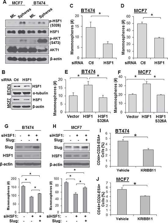 Figure 4: Loss of HSF1 activity reduces growth of mammospheres and breast cancer stem cells. (A) MCF7 and BT474 cells were seeded for the mammosphere assay as described in Materials and Methods. Spheres were collected and total protein was isolated. Sphere lysates and lysates from monolayer (ML) cells were subjected to immunoblotting using the indicated antibodies. (B) Cells were transfected with control or HSF1 siRNA followed by immunoblotting. (C–D) BT474 and MCF7 cells with and without HSF1 knockdown from (B) were seeded for the mammosphere assay. (E–F) BT474 and MCF7 cells were transfected with an empty vector, HSF1, or HSF1-S326A followed by seeding for the mammosphere assay. (G–H) BT474 and MCF7 cells were transfected with non-targeting siRNA + an empty vector, HSF1 siRNA + empty vector, or HSF1 siRNA + Slug followed by seeding for the mammosphere assay. (I–J) BT474 (G) and MCF7 (H) were treated with KRIBB11 (5 μM) for 24 hrs and then subjected to flow cytometry for the CD44highCD24lowESAhigh cell population and the percentage of cells in the population is reported. *Indicates significant difference (p < 0.05).