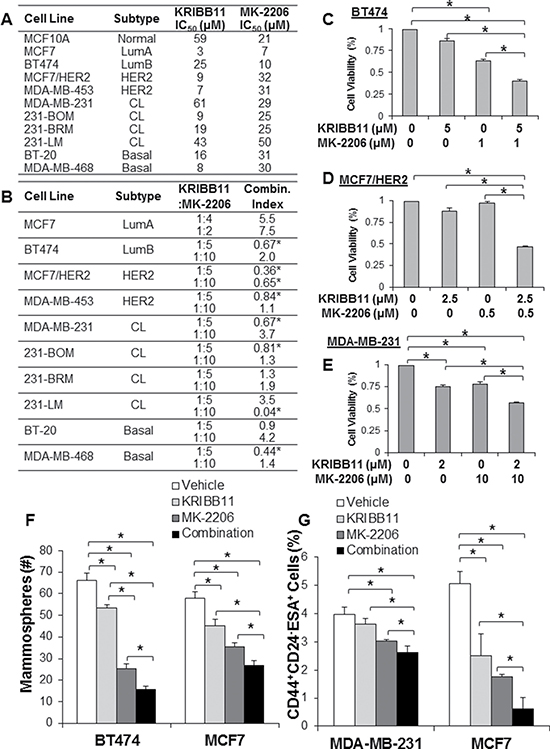 Figure 5: Combined inhibition of HSF1 and AKT synergistically kills breast cancer cells of different subtypes. (A) Indicated cell lines were treated with KRIBB11 or MK-2206 for 48 hrs followed by assessment of cell viability to determine the IC50 for both inhibitors. (B) Indicated cell lines were treated with vehicle, KRIBB11 alone, MK-2206 alone, or both KRIBB11 and MK-2206 in combination at the indicated drug molar ratios for 48 hrs followed by assessment of cell viability. Combination index was calculated using Calcusyn software. (C–E) Representative individual viability assay results from (B) for indicated cell lines. F-G) BT474 and MCF7 cells were treated with vehicle, KRIBB11 alone (BT474: 2 μM; MCF7: 10 μM), MK-2206 alone (BT474: 2 μM; MCF7: 8 μM), or both KRIBB11 and MK-2206. After 48 hrs of treatment on adherent plates, cells were trypsinized, counted and subjected to the mammosphere assay (F) or flow cytometry (G) to detect the tumor initiating cell population. *Indicates significant difference (p < 0.05).