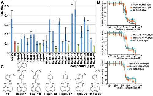 Figure 1: Identification of novel small molecule Hepsin inhibitors. (A) Attenuation of Hepsin-dependent proteolytic activity by the lead compound #4 [20] and its derivatives. Purified recombinant Hepsin was preincubated with 2 µM of the indicated compounds for 30 min. The residual percent activity of the enzyme toward the chromogenic substrate was determined using a microplate reader at 405 nm. Data are the means of three independent experiments ±SD. (B) IC50 determination for Hepsin inhibitors #4, HepIn-1, HepIn-8, HepIn-13, HepIn-17, HepIn-20, HepIn-25. Data are the means of three independent experiments ±SD. (C) Chemical structures of identified Hepsin inhibitors.