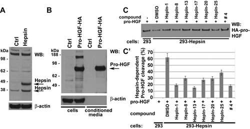 Figure 2: Hepsin inhibitors attenuate the Hepsin-mediated cleavage of pro-HGF in cell based activity assays. (A) Western blot (WB) analysis of vector control- (Ctrl) or Hepsin-expressing HEK 293 cells with anti-Hepsin and anti-β-actin antibodies. Note that Hepsin is present as both full-length (precursor) and cleaved (activated) enzymes. (B) Western blot (WB) analysis of vector control (Ctrl) or pro-HGF-HA expressing HEK 293 cells and their conditioned media with anti-HA and anti-β-actin antibodies. (C) Cell-based Hepsin activity assay. Control or Hepsin-expressing 293 cells in the presence of DMSO or 10µM of indicated compounds were cultured for 2 hours in media containing pro-HGF-HA, and the remaining uncleaved pro-HGF-HA was detected by Western blotting with anti-HA antibodies. (C’) Quantitation of data shown in C. Data are the means of three independent experiments ±SD