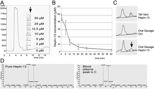 Figure 3: Pharmacokinetics and oral bioavailability of the Hepsin inhibitor HepIn-13. (A) Analytical HPLC profiles (mAU at 220 nm) of HepIn-13 which was dissolved in the mouse blood plasma at indicated concentrations and then extracted and analyzed by HPLC. (B) Blood concentrations of HepIn-13 at indicated time points after tail vein injection of 1 mg of the compound. Data are the means of three independent experiments ±SD. (C) HepIn-13 is orally bioavailable. Analytical HPLC profiles (mAU at 220 nm) of blood plasma extracts: from tail vein injected with HepIn-13, untreated and oral gavage treated mice. (D) Mass Spectrometry confirmation of the presence of HepIn-13 in blood plasma in the peak highlighted by arrow in panel C.