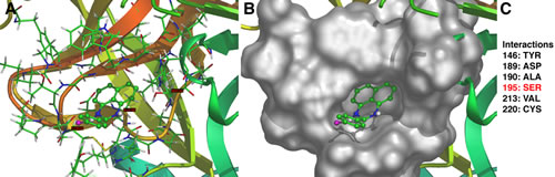Figure 4: Predicted model of Hepsin–HepIn-13 interaction. The best-ranked calculated docking of HepIn-13 with Hepsin predicts an interaction of the compound with the Hepsin catalytic domain. (A) Ribbon model of Hepsin-HepIn-13 interaction. (B) Surface model of Hepsin-HepIn-13 interaction. (C) Amino acids of Hepsin involved in interaction. Note, Ser353(195) is a part of Hepsin catalytic triad [23]